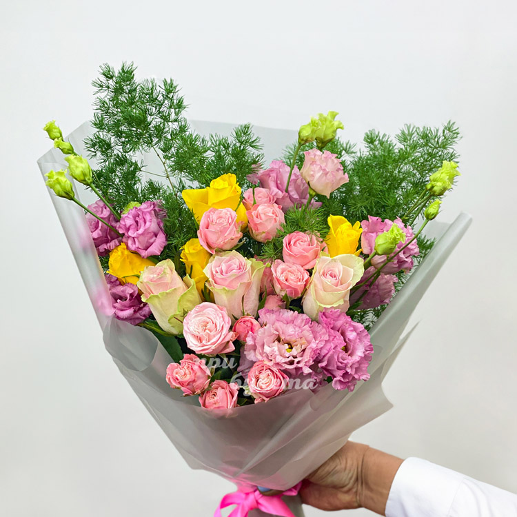Букет розовых роз и эустом с зеленью