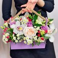 Фиолетовый букет орхидей и куст. роз