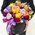 Фрукты и ирисы в шляпной коробке