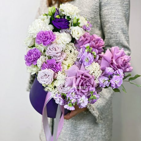 Коробка сиреневых маттиол, роз и гвоздик