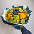 Корзина с белыми эустомами и фруктами