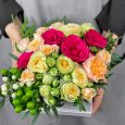 Корзина ярких роз с гипсофилой и лимониумом