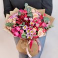Розовый букет кустовых роз и хризантем
