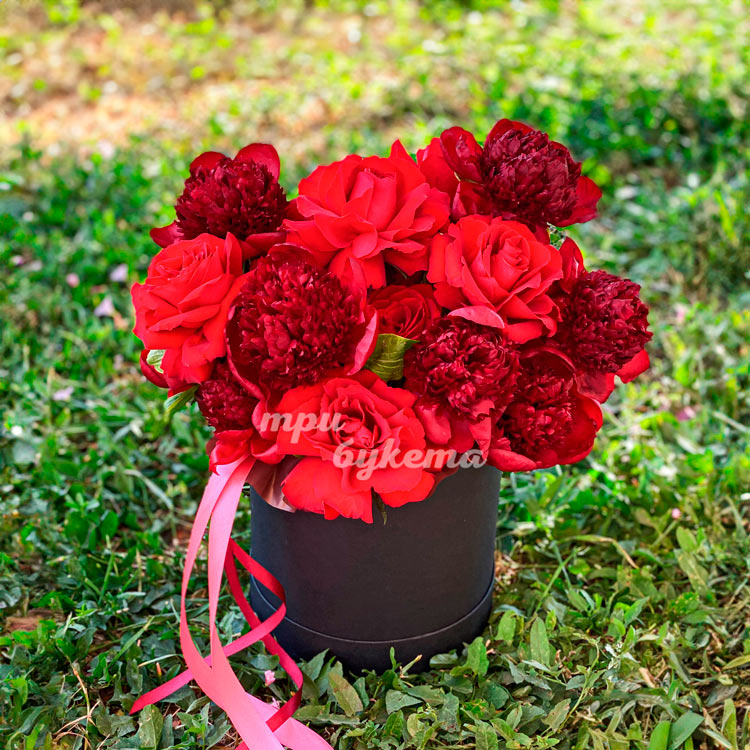 Шляпная коробка красных роз и пионов